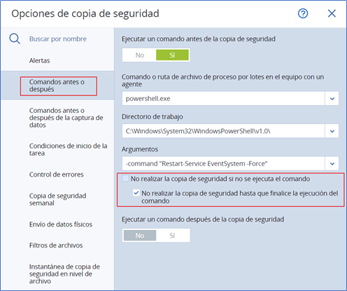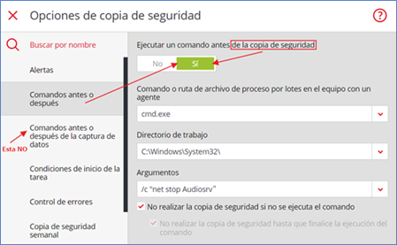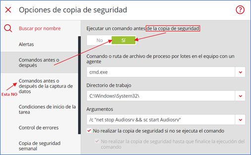 Si se desea detener un servicio hasta finaliza el backup, por ejemplo, el audio de Windows (servicio “Audiosrv”) antes de hacer la copia (es mejor solo detenerlo y para iniciarlo nuevamente usar las tareas programadas de Windows, así si falla el inicio despues del backup – en caso tal que el servicio se haya reiniciado solo – no mostraría un mensaje de error)