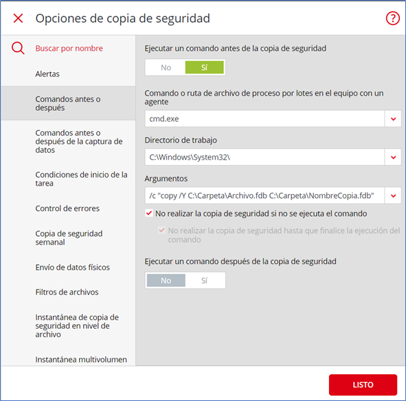 Esta funcionalidad es útil en casos de bases de datos que no permiten crear en caliente una copia en la nube (por ejemplo Firebird), donde se puede crear una copia del archivo en caliente (Archivo.fdb), y luego a esa copia (NombreCopia.fdb) se le hace el backup en la nube.