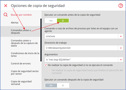 Recomendado (Detener servicio desde plan de copia y reiniciarlo usando tareas de Windows):