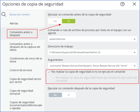 Nota: Si la validación anterior muestra que el problema eran los servicios “COM+ Event System service” (servicio EventSystem) / “Volume Shadow Copy” (servicio VSS), y se observa que es repetitivo el problema, se puede en propiedades de la copia habilitar un comando de Powershell antes de la copia que reinicie estos servicios y sus dependencias:
