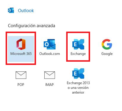 Seleccione el servidor de correo electrónico, puede ser Microsoft 365 o Exchange.